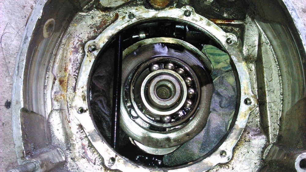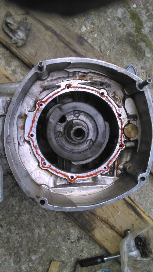 Then, heating the main bearings with a gas burner, I installed them in place. Finally, they fall into place when you put the pressure washer in place in front (it was replaced with a new one, the old one did not begin to be restored). And behind the back cover. To do this, first they are upset with long bolts, and then native bolts are put in their place. I put the back cover on a sealant so as not to suffer with cutting out a new gasket.